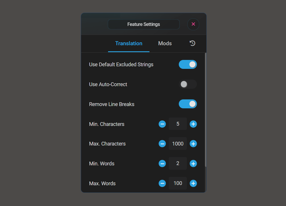 Use Case: In games that display a lot of text on screen (not just dialogue), you can increase the Min. Characters and Min. Words values to ensure only dialogue text is translated. This filters out UI elements, button labels, and short system messages.